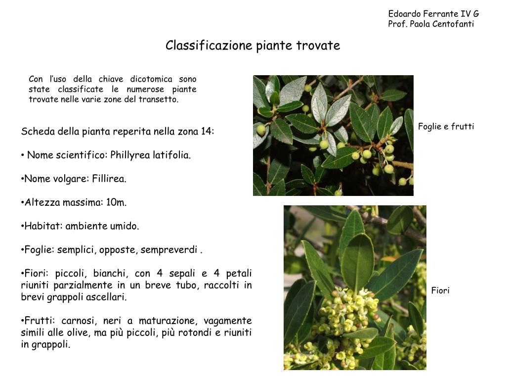 Edoardo Ferrante IV G Prof. Paola Centofanti Classificazione piante trovate Con l’uso della chiave dicotomica sono state classificate le numerose piante trovate nelle varie zone del transetto. Foglie e frutti • Scheda della pianta reperita nella zona 14: • Nome scientifico: Phillyrealatifolia. • Nome volgare: Fillirea. • Altezza massima: 10m. • Habitat: ambiente umido. • Foglie: semplici, opposte, sempreverdi . • Fiori: piccoli, bianchi, con 4 sepali e 4 petali riuniti parzialmente in un breve tubo, raccolti in brevi grappoli ascellari. • Frutti: carnosi, neri a maturazione, vagamente simili alle olive, ma più piccoli, più rotondi e riuniti in grappoli. Fiori
