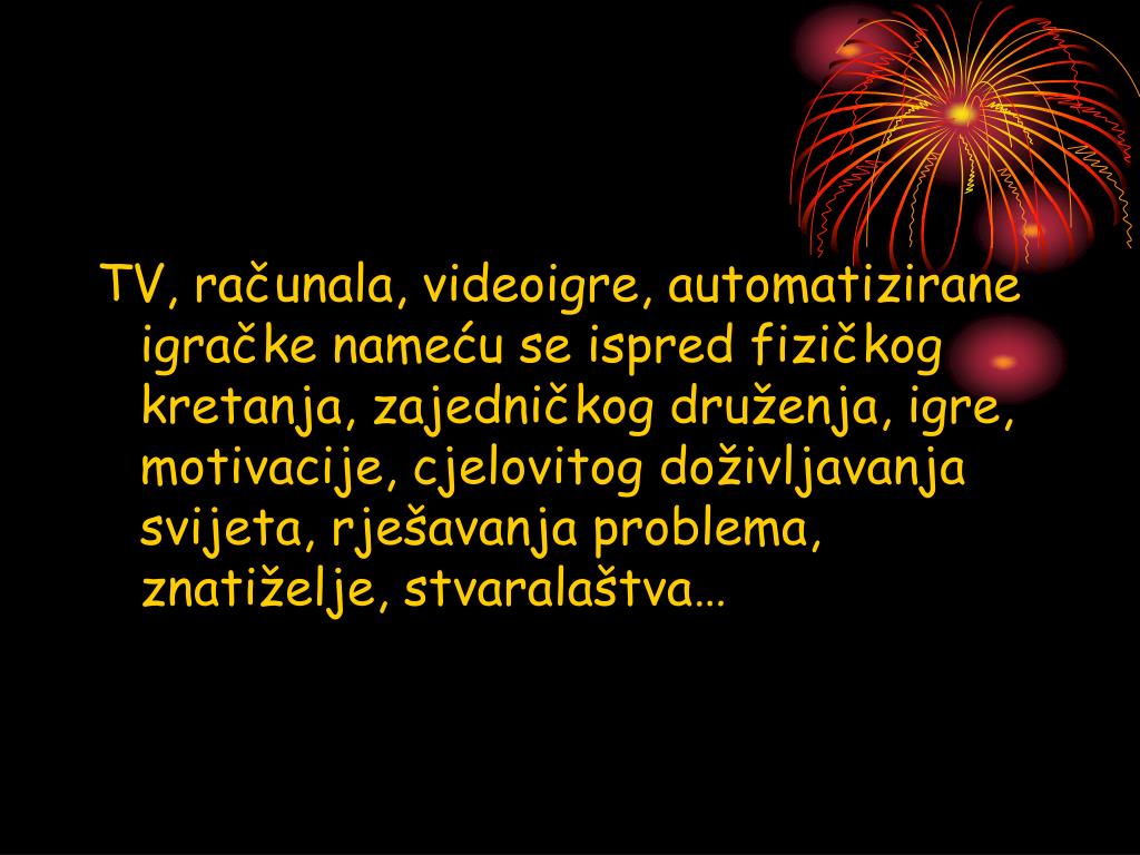TV, računala, videoigre, automatizirane igračke nameću se ispred fizičkog kretanja, zajedničkog druženja, igre, motivacije, cjelovitog doživljavanja svijeta, rješavanja problema, znatiželje, stvaralaštva…