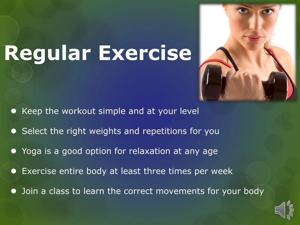 Regular Exercise • Keep the workout simple and at your level • Select the right weights and repetitions for you • Yoga is a good option for relaxation at any age • Exercise entire body at least three times per week • Join a class to learn the correct movements for your body