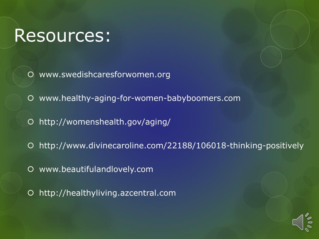 Resources: • www.swedishcaresforwomen.org • www.healthy-aging-for-women-babyboomers.com • http://womenshealth.gov/aging/ • http://www.divinecaroline.com/22188/106018-thinking-positively • www.beautifulandlovely.com • http://healthyliving.azcentral.com
