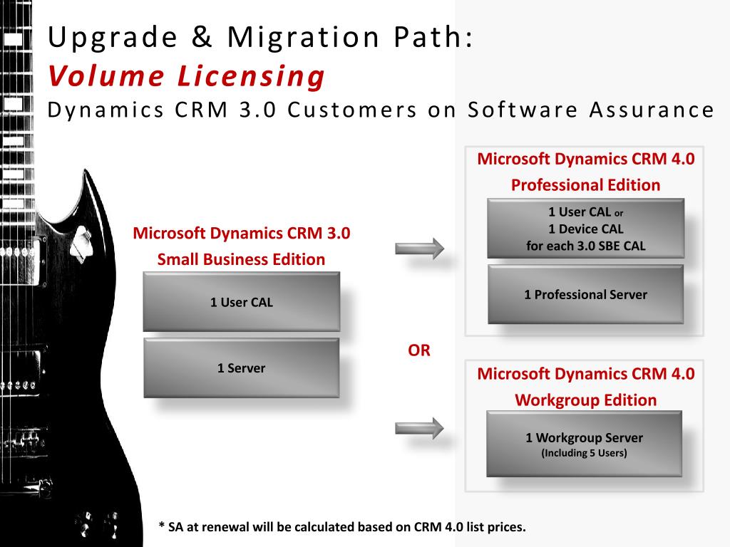 Upgrade & Migration Path: Volume LicensingDynamics CRM 3.0 Customers on Software Assurance Microsoft Dynamics CRM 4.0 Professional Edition 1 User CAL or 1 Device CAL for each 3.0 SBE CAL Microsoft Dynamics CRM 3.0 Small Business Edition 1 Professional Server 1 User CAL OR 1 Server Microsoft Dynamics CRM 4.0 Workgroup Edition 1 Workgroup Server (Including 5 Users) * SA at renewal will be calculated based on CRM 4.0 list prices.