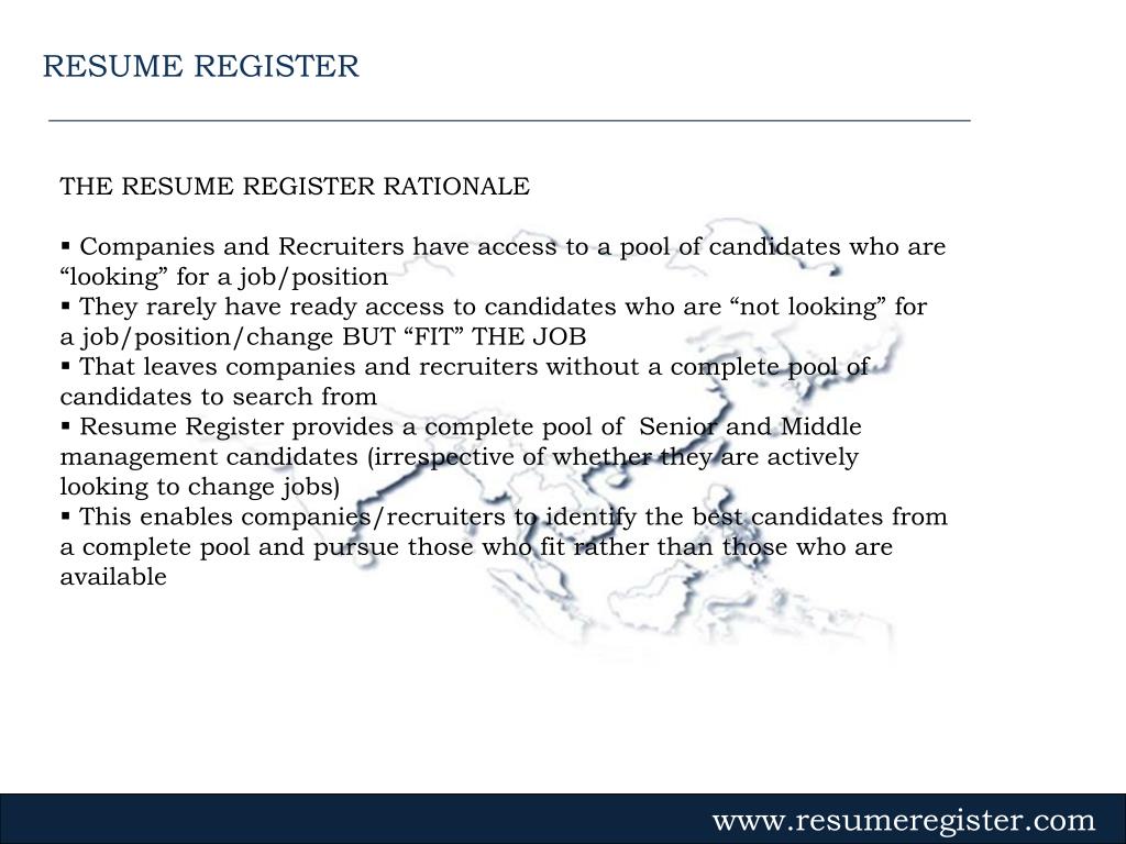 RESUME REGISTER THE RESUME REGISTER RATIONALE Companies and Recruiters have access to a pool of candidates who are “looking” for a job/position They rarely have ready access to candidates who are “not looking” for a job/position/change BUT “FIT” THE JOB That leaves companies and recruiters without a complete pool of candidates to search from Resume Register provides a complete pool of Senior and Middle management candidates (irrespective of whether they are actively looking to change jobs) This enables companies/recruiters to identify the best candidates from a complete pool and pursue those who fit rather than those who are available www.resumeregister.com