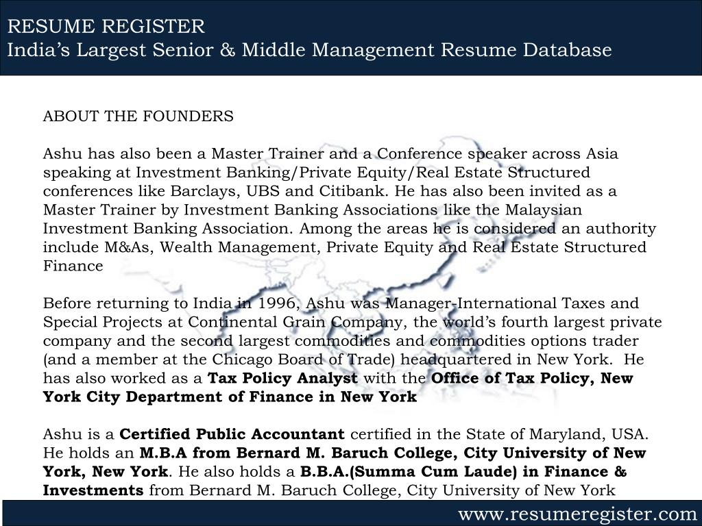 RESUME REGISTER India’s Largest Senior & Middle Management Resume Database ABOUT THE FOUNDERS Ashu has also been a Master Trainer and a Conference speaker across Asia speaking at Investment Banking/Private Equity/Real Estate Structured conferences like Barclays, UBS and Citibank. He has also been invited as a Master Trainer by Investment Banking Associations like the Malaysian Investment Banking Association. Among the areas he is considered an authority include M&As, Wealth Management, Private Equity and Real Estate Structured Finance Before returning to India in 1996, Ashu was Manager-International Taxes and Special Projects at Continental Grain Company, the world’s fourth largest private company and the second largest commodities and commodities options trader (and a member at the Chicago Board of Trade) headquartered in New York. He has also worked as a Tax Policy Analyst with the Office of Tax Policy, New York City Department of Finance in New York Ashu is a Certified Public Accountant certified in the State of Maryland, USA. He holds an M.B.A from Bernard M. Baruch College, City University of New York, New York. He also holds a B.B.A.(Summa Cum Laude) in Finance & Investments from Bernard M. Baruch College, City University of New York Gvmk,bj. www.resumeregister.com