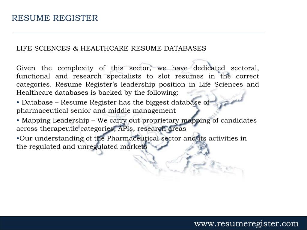 RESUME REGISTER LIFE SCIENCES & HEALTHCARE RESUME DATABASES Given the complexity of this sector, we have dedicated sectoral, functional and research specialists to slot resumes in the correct categories. Resume Register’s leadership position in Life Sciences and Healthcare databases is backed by the following: Database – Resume Register has the biggest database of pharmaceutical senior and middle management Mapping Leadership – We carry out proprietary mapping of candidates across therapeutic categories, APIs, research areas Our understanding of the Pharmaceutical sector and its activities in the regulated and unregulated markets www.resumeregister.com
