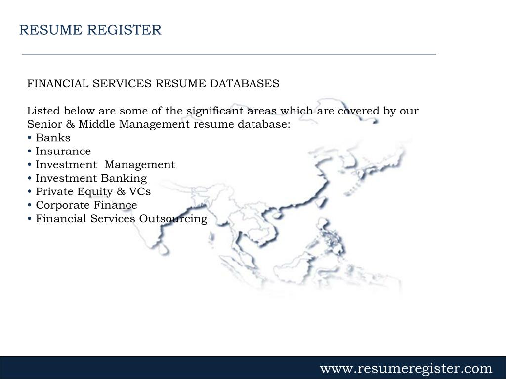 RESUME REGISTER FINANCIAL SERVICES RESUME DATABASES Listed below are some of the significant areas which are covered by our Senior & Middle Management resume database: Banks Insurance Investment Management Investment Banking Private Equity & VCs Corporate Finance Financial Services Outsourcing www.resumeregister.com