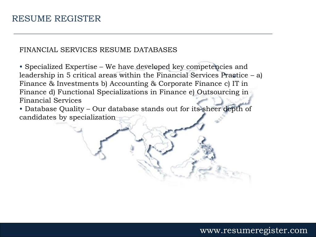 RESUME REGISTER FINANCIAL SERVICES RESUME DATABASES Specialized Expertise – We have developed key competencies and leadership in 5 critical areas within the Financial Services Practice – a) Finance & Investments b) Accounting & Corporate Finance c) IT in Finance d) Functional Specializations in Finance e) Outsourcing in Financial Services Database Quality – Our database stands out for its sheer depth of candidates by specialization www.resumeregister.com