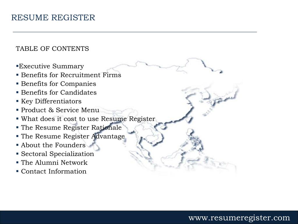 RESUME REGISTER TABLE OF CONTENTS Executive Summary Benefits for Recruitment Firms Benefits for Companies Benefits for Candidates Key Differentiators Product & Service Menu What does it cost to use Resume Register The Resume Register Rationale The Resume Register Advantage About the Founders Sectoral Specialization The Alumni Network Contact Information www.resumeregister.com
