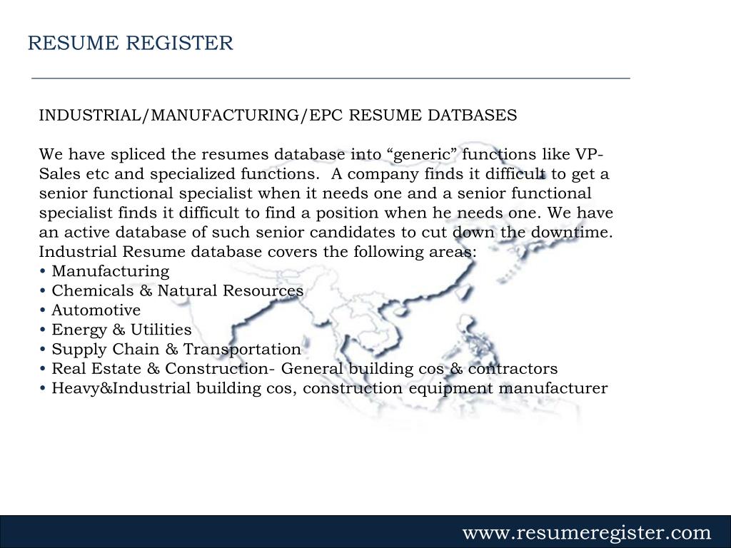 RESUME REGISTER INDUSTRIAL/MANUFACTURING/EPC RESUME DATBASES We have spliced the resumes database into “generic” functions like VP-Sales etc and specialized functions. A company finds it difficult to get a senior functional specialist when it needs one and a senior functional specialist finds it difficult to find a position when he needs one. We have an active database of such senior candidates to cut down the downtime. Industrial Resume database covers the following areas: Manufacturing Chemicals & Natural Resources Automotive Energy & Utilities Supply Chain & Transportation Real Estate & Construction- General building cos & contractors Heavy&Industrial building cos, construction equipment manufacturer www.resumeregister.com