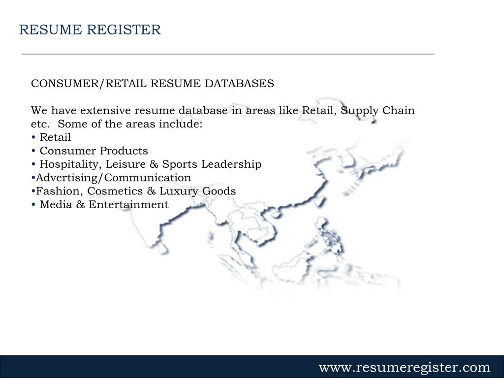 RESUME REGISTER CONSUMER/RETAIL RESUME DATABASES We have extensive resume database in areas like Retail, Supply Chain etc. Some of the areas include: Retail Consumer Products Hospitality, Leisure & Sports Leadership Advertising/Communication Fashion, Cosmetics & Luxury Goods Media & Entertainment www.resumeregister.com