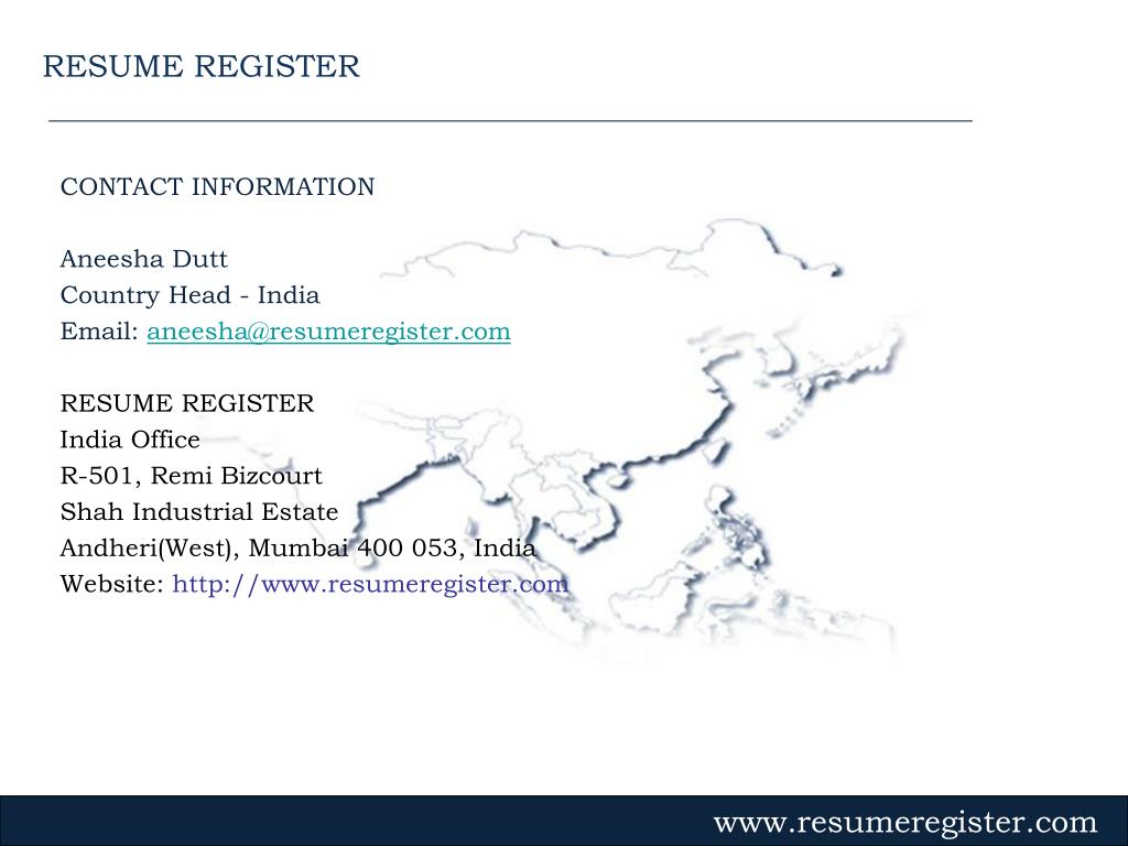 RESUME REGISTER CONTACT INFORMATION Aneesha Dutt Country Head - India Email: aneesha@resumeregister.com RESUME REGISTER India Office R-501, Remi Bizcourt Shah Industrial Estate Andheri(West), Mumbai 400 053, India Website: http://www.resumeregister.com www.resumeregister.com