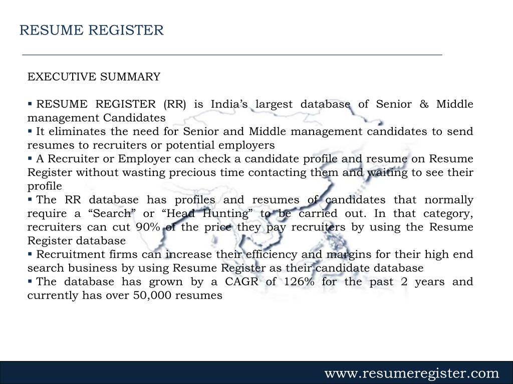 RESUME REGISTER EXECUTIVE SUMMARY RESUME REGISTER (RR) is India’s largest database of Senior & Middle management Candidates It eliminates the need for Senior and Middle management candidates to send resumes to recruiters or potential employers A Recruiter or Employer can check a candidate profile and resume on Resume Register without wasting precious time contacting them and waiting to see their profile The RR database has profiles and resumes of candidates that normally require a “Search” or “Head Hunting” to be carried out. In that category, recruiters can cut 90% of the price they pay recruiters by using the Resume Register database Recruitment firms can increase their efficiency and margins for their high end search business by using Resume Register as their candidate database The database has grown by a CAGR of 126% for the past 2 years and currently has over 50,000 resumes www.resumeregister.com