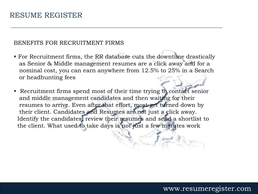RESUME REGISTER BENEFITS FOR RECRUITMENT FIRMS For Recruitment firms, the RR database cuts the downtime drastically as Senior & Middle management resumes are a click away and for a nominal cost, you can earn anywhere from 12.5% to 25% in a Search or headhunting fees Recruitment firms spend most of their time trying to contact senior and middle management candidates and then waiting for their resumes to arrive. Even after that effort, most get turned down by their client. Candidates and Resumes are not just a click away. Identify the candidates, review their resumes and send a shortlist to the client. What used to take days is not just a few minutes work www.resumeregister.com