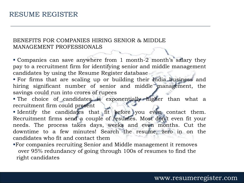 RESUME REGISTER BENEFITS FOR COMPANIES HIRING SENIOR & MIDDLE MANAGEMENT PROFESSIONALS Companies can save anywhere from 1 month-2 month’s salary they pay to a recruitment firm for identifying senior and middle management candidates by using the Resume Register database For firms that are scaling up or building their India business and hiring significant number of senior and middle management, the savings could run into crores of rupees The choice of candidates is exponentially higher than what a recruitment firm could present Identify the candidates that fit before you even contact them. Recruitment firms send a couple of resumes. Most don’t even fit your needs. The process takes days, weeks and even months. Cut the downtime to a few minutes! Search the resume, zero in on the candidates who fit and contact them For companies recruiting Senior and Middle management it removes over 95% redundancy of going through 100s of resumes to find the right candidates www.resumeregister.com