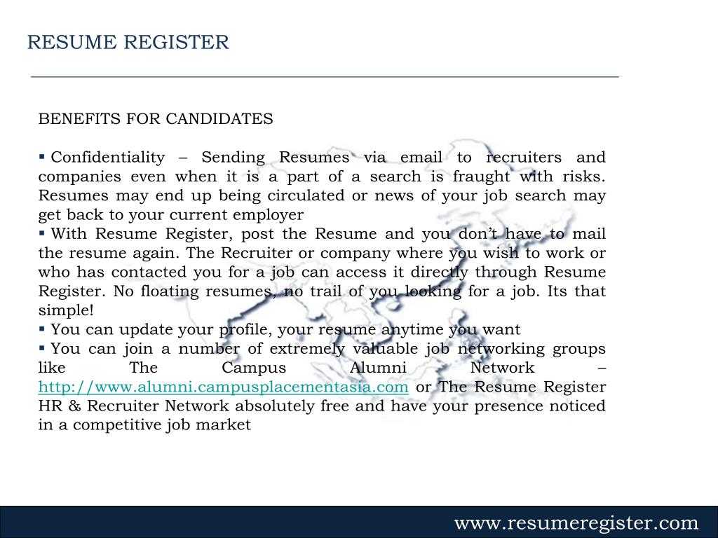 RESUME REGISTER BENEFITS FOR CANDIDATES Confidentiality – Sending Resumes via email to recruiters and companies even when it is a part of a search is fraught with risks. Resumes may end up being circulated or news of your job search may get back to your current employer With Resume Register, post the Resume and you don’t have to mail the resume again. The Recruiter or company where you wish to work or who has contacted you for a job can access it directly through Resume Register. No floating resumes, no trail of you looking for a job. Its that simple! You can update your profile, your resume anytime you want You can join a number of extremely valuable job networking groups like The Campus Alumni Network – http://www.alumni.campusplacementasia.com or The Resume Register HR & Recruiter Network absolutely free and have your presence noticed in a competitive job market www.resumeregister.com