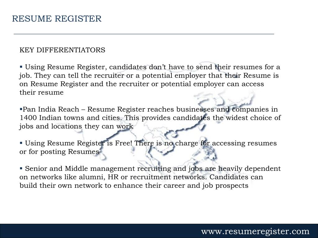 RESUME REGISTER KEY DIFFERENTIATORS Using Resume Register, candidates don’t have to send their resumes for a job. They can tell the recruiter or a potential employer that their Resume is on Resume Register and the recruiter or potential employer can access their resume Pan India Reach – Resume Register reaches businesses and companies in 1400 Indian towns and cities. This provides candidates the widest choice of jobs and locations they can work Using Resume Register is Free! There is no charge for accessing resumes or for posting Resumes Senior and Middle management recruiting and jobs are heavily dependent on networks like alumni, HR or recruitment networks. Candidates can build their own network to enhance their career and job prospects www.resumeregister.com