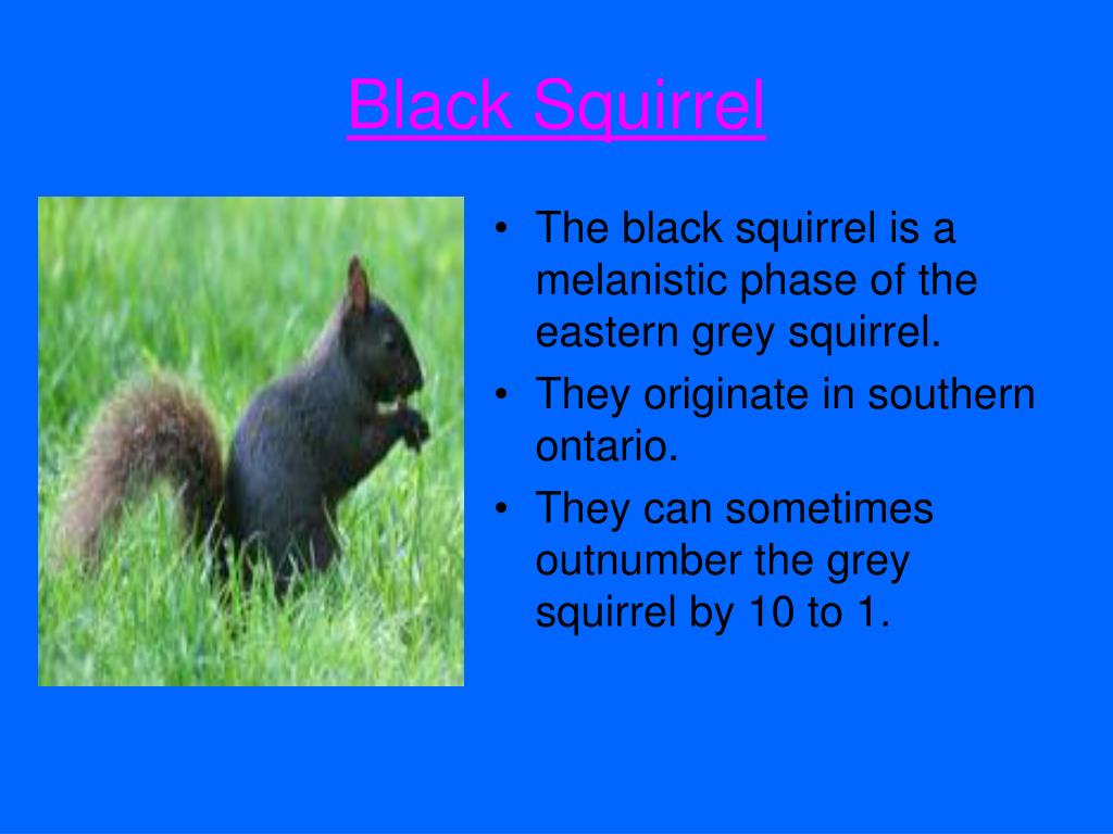 Black Squirrel • The black squirrel is a melanistic phase of the eastern grey squirrel. • They originate in southern ontario. • They can sometimes outnumber the grey squirrel by 10 to 1.