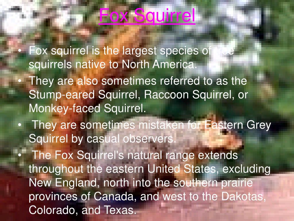 Fox Squirrel • Fox squirrel is the largest species of tree squirrels native to North America. • They are also sometimes referred to as the Stump-eared Squirrel, Raccoon Squirrel, or Monkey-faced Squirrel. • They are sometimes mistaken for Eastern Grey Squirrel by casual observers. • The Fox Squirrel's natural range extends throughout the eastern United States, excluding New England, north into the southern prairie provinces of Canada, and west to the Dakotas, Colorado, and Texas.