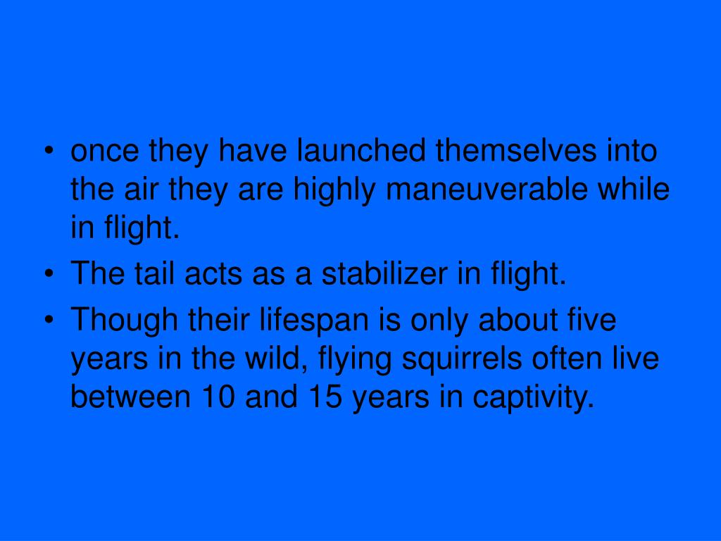 once they have launched themselves into the air they are highly maneuverable while in flight. • The tail acts as a stabilizer in flight. • Though their lifespan is only about five years in the wild, flying squirrels often live between 10 and 15 years in captivity.