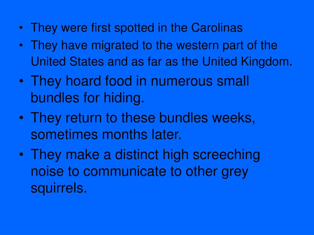 They were first spotted in the Carolinas • They have migrated to the western part of the United States and as far as the United Kingdom. • They hoard food in numerous small bundles for hiding. • They return to these bundles weeks, sometimes months later. • They make a distinct high screeching noise to communicate to other grey squirrels.