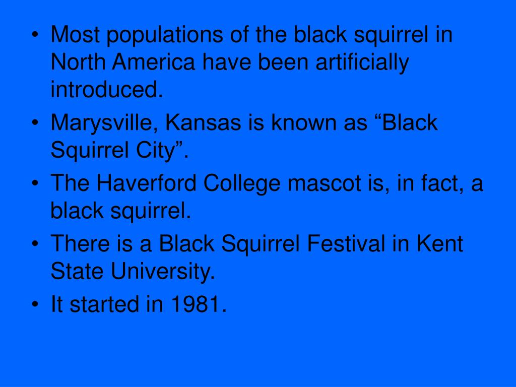 Most populations of the black squirrel in North America have been artificially introduced. • Marysville, Kansas is known as “Black Squirrel City”. • The Haverford College mascot is, in fact, a black squirrel. • There is a Black Squirrel Festival in Kent State University. • It started in 1981.