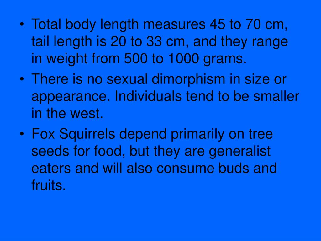 Total body length measures 45 to 70 cm, tail length is 20 to 33 cm, and they range in weight from 500 to 1000 grams. • There is no sexual dimorphism in size or appearance. Individuals tend to be smaller in the west. • Fox Squirrels depend primarily on tree seeds for food, but they are generalist eaters and will also consume buds and fruits.