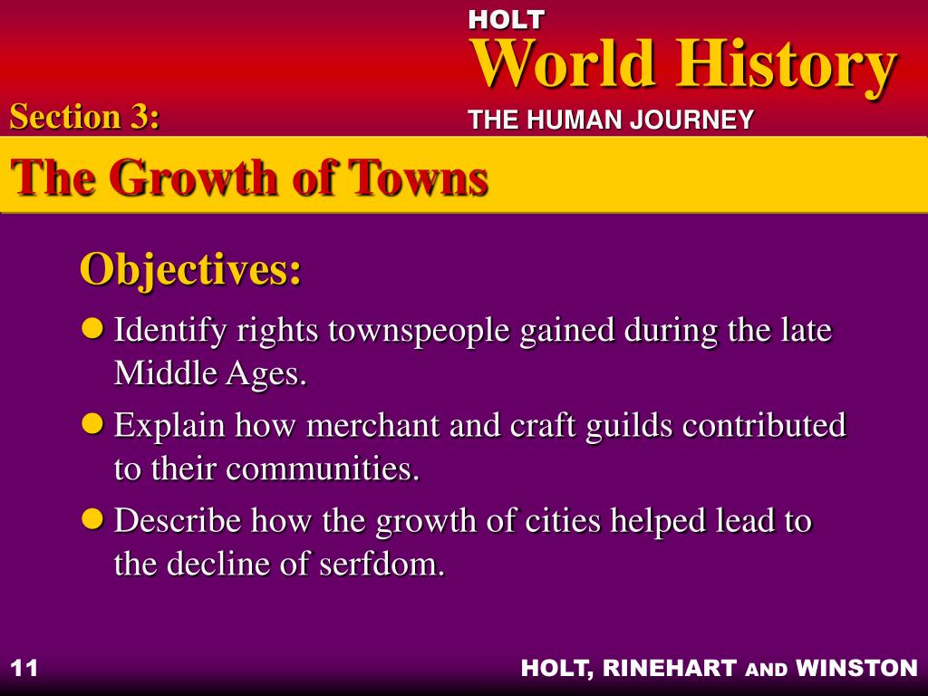 Section 3: The Growth of Towns Objectives: • Identify rights townspeople gained during the late Middle Ages. • Explain how merchant and craft guilds contributed to their communities. • Describe how the growth of cities helped lead to the decline of serfdom.