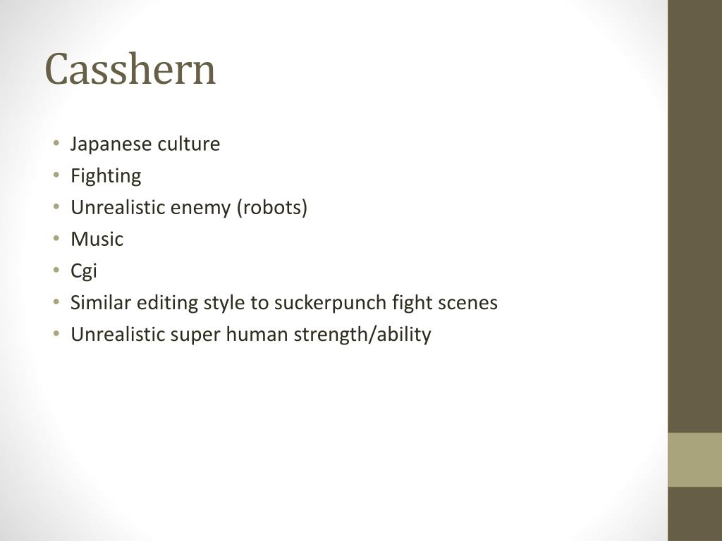 Casshern • Japanese culture • Fighting • Unrealistic enemy (robots) • Music • Cgi • Similar editing style to suckerpunch fight scenes • Unrealistic super human strength/ability