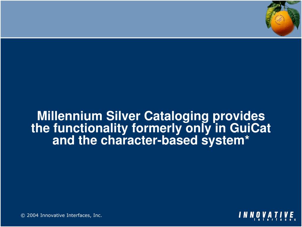 Cataloging: Millennium Silver and Beyond. Claudia Conrad Product Manager, Cataloging ALA Annual 2004. Millennium Silver. Millennium Silver Cataloging provides the functionality formerly only in GuiCat and the character-based system*.