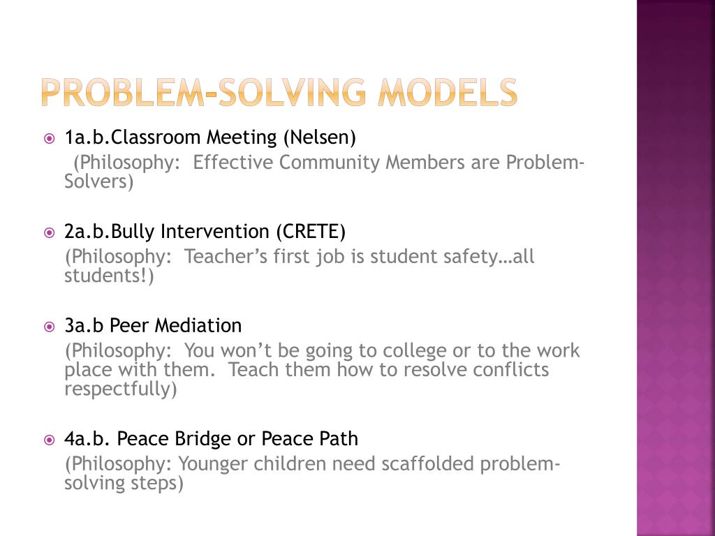 Problem-solving models • 1a.b.Classroom Meeting (Nelsen) (Philosophy: Effective Community Members are Problem- Solvers) • 2a.b.Bully Intervention (CRETE) (Philosophy: Teacher’s first job is student safety…all students!) • 3a.b Peer Mediation (Philosophy: You won’t be going to college or to the work place with them. Teach them how to resolve conflicts respectfully) • 4a.b. Peace Bridge or Peace Path (Philosophy: Younger children need scaffolded problem-solving steps)