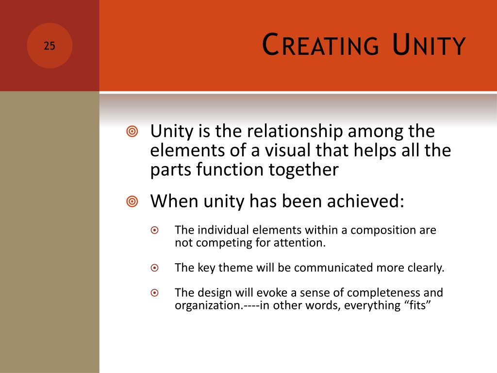 Creating Unity • Unity is the relationship among the elements of a visual that helps all the parts function together • When unity has been achieved: • The individual elements within a composition are not competing for attention. • The key theme will be communicated more clearly. • The design will evoke a sense of completeness and organization.----in other words, everything “fits”