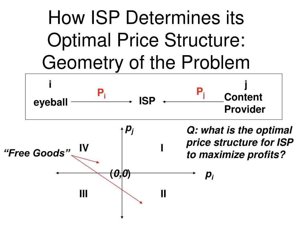 How ISP Determines its Optimal Price Structure: Geometry of the Problem Pj i j Pi Content Provider ISP eyeball pj Q: what is the optimal price structure for ISP to maximize profits? IV I “Free Goods” (0,0) pi III II