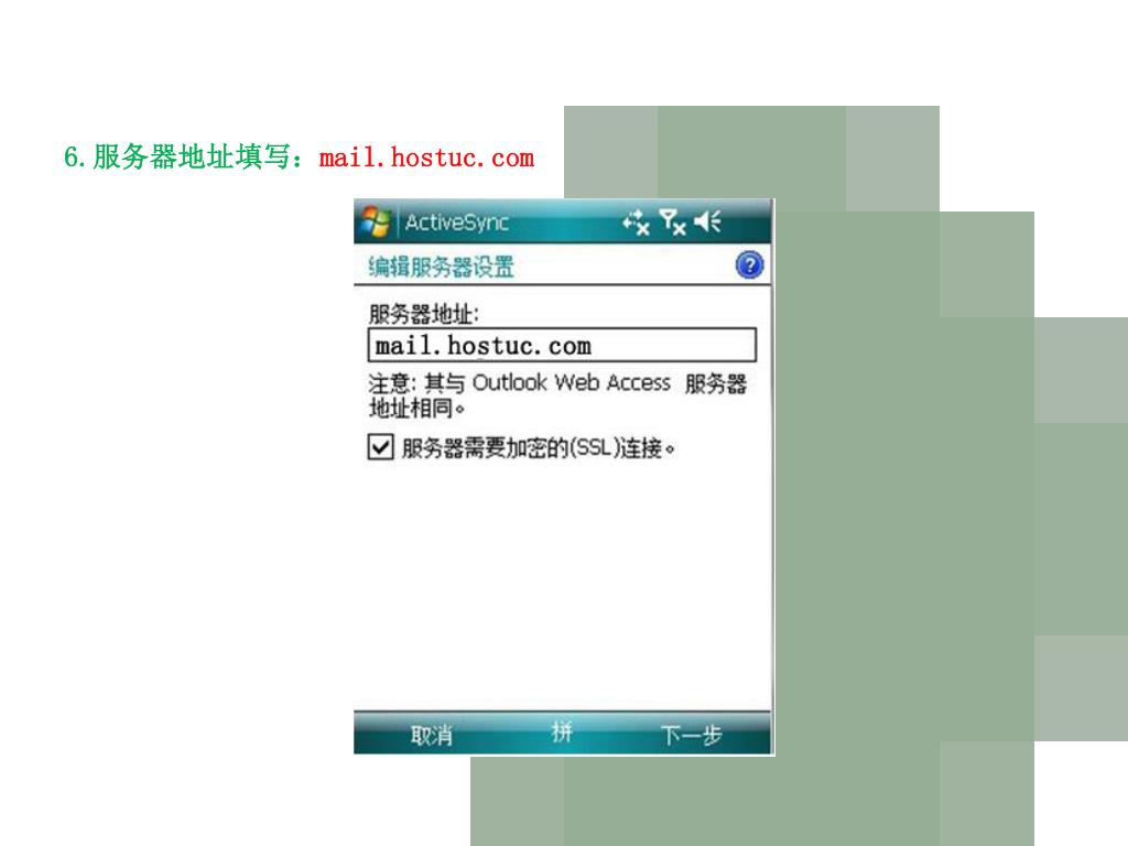 睿邮. 手机 Push Mail 与数据同步设置方法. Windows Mobil 系统(多普达,夏新,惠普,华硕等)手机设置方法. 1. 下载证书 2. 将下载到电脑的证书通过数据线,蓝牙等方式传送到手机 3. 在手机文件夹找到证书文件,点击安装. 4. 点击开始 --- 程序菜单 , 选择点击“ ActiveSync ” 图标. 5. 点击“菜单” -“ 添加源服务器 ”. 6. 服务器地址填写: mail.hostuc.com.