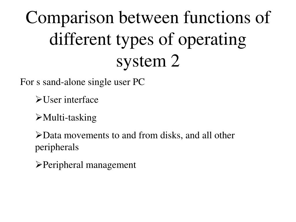 Comparison between functions of different types of operating system 2 • For s sand-alone single user PC • User interface • Multi-tasking • Data movements to and from disks, and all other peripherals • Peripheral management