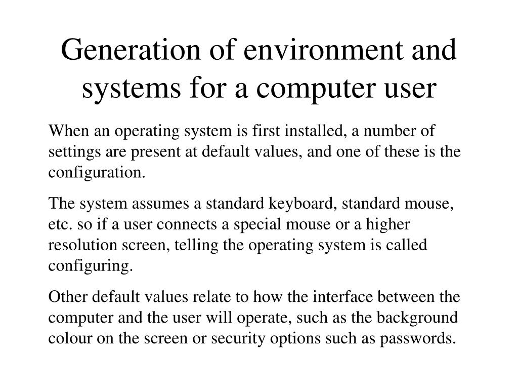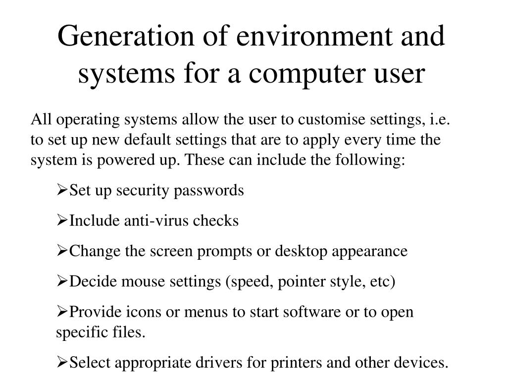 Generation of environment and systems for a computer user • All operating systems allow the user to customise settings, i.e. to set up new default settings that are to apply every time the system is powered up. These can include the following: • Set up security passwords • Include anti-virus checks • Change the screen prompts or desktop appearance • Decide mouse settings (speed, pointer style, etc) • Provide icons or menus to start software or to open specific files. • Select appropriate drivers for printers and other devices.