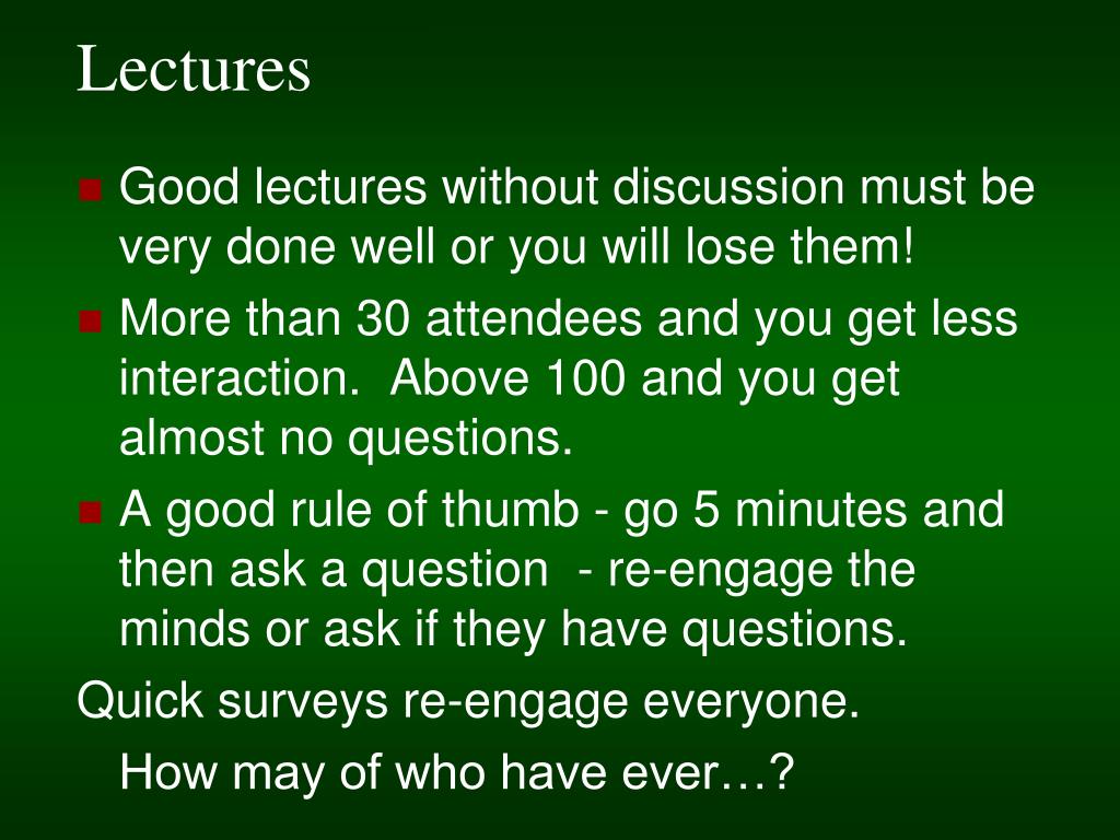 Lectures • Good lectures without discussion must be very done well or you will lose them! • More than 30 attendees and you get less interaction. Above 100 and you get almost no questions. • A good rule of thumb - go 5 minutes and then ask a question - re-engage the minds or ask if they have questions. Quick surveys re-engage everyone. How may of who have ever…?