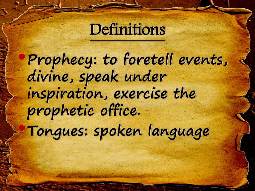 Definitions • Prophecy: to foretell events, divine, speak under inspiration, exercise the prophetic office. • Tongues: spoken language