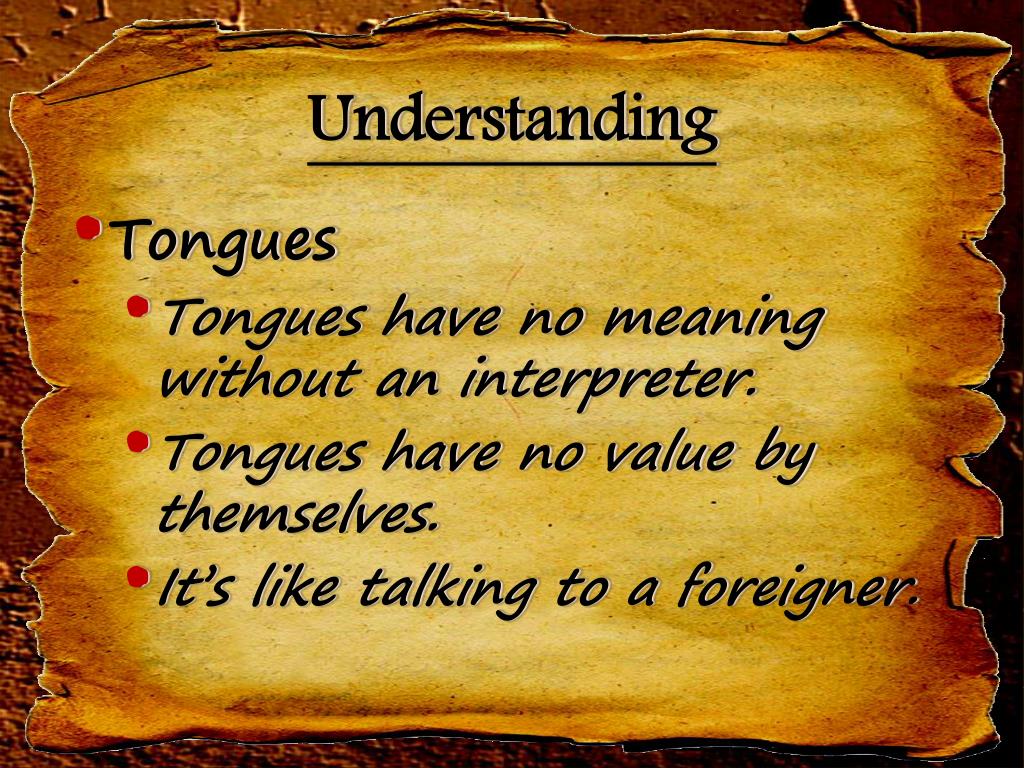 Understanding • Tongues • Tongues have no meaning without an interpreter. • Tongues have no value by themselves. • It’s like talking to a foreigner.