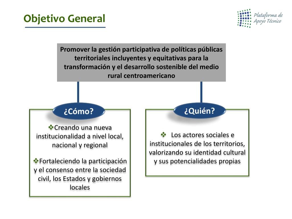 Objetivo General Promover la gestión participativa de políticas públicas territoriales incluyentes y equitativas para la transformación y el desarrollo sostenible del medio rural centroamericano ¿Cómo? ¿Quién? • Creando una nueva institucionalidad a nivel local, nacional y regional • Fortaleciendo la participación y el consenso entre la sociedad civil, los Estados y gobiernos locales • Los actores sociales e institucionales de los territorios, valorizando su identidad cultural y sus potencialidades propias