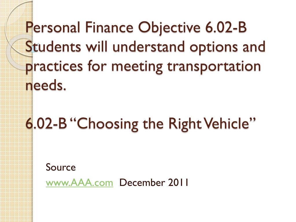 Personal Finance Objective 6.02-B Students will understand options and practices for meeting transportation needs. 6.02-B “Choosing the Right Vehicle”. Source www.AAA.com December 2011 . Factors to Consider Before Purchasing. Determine what is affordable for you