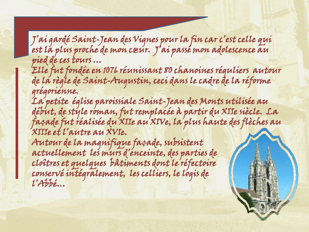 J’ai gardé Saint-Jean des Vignes pour la fin car c’est celle qui est la plus proche de mon cœur. J’ai passé mon adolescence au pied de ces tours … Elle fut fondée en 1076 réunissant 80 chanoines réguliers autour de la règle de Saint-Augustin, ceci dans le cadre de la réforme grégorienne. La petite église paroissiale Saint-Jean des Monts utilisée au début, de style roman, fut remplacée à partir du XIIe siècle. La façade fut réalisée du XIIe au XIVe, la plus haute des flèches au XIIIe et l’autre au XVIe. Autour de la magnifique façade, subsistent actuellement les murs d’enceinte, des parties de cloîtres et quelques bâtiments dont le réfectoire conservé intégralement, les celliers, le logis de l’Abbé…