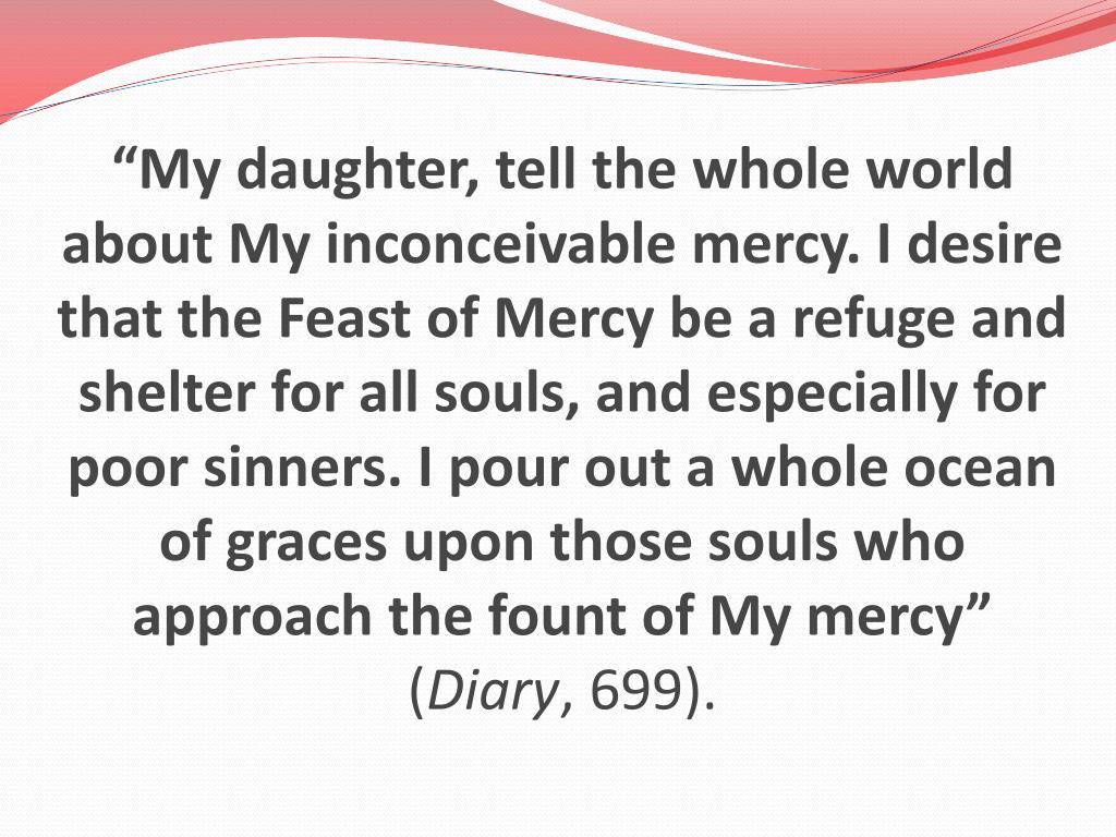 “My daughter, tell the whole world about My inconceivable mercy. I desire that the Feast of Mercy be a refuge and shelter for all souls, and especially for poor sinners. I pour out a whole ocean of graces upon those souls who approach the fount of My mercy”(Diary, 699).