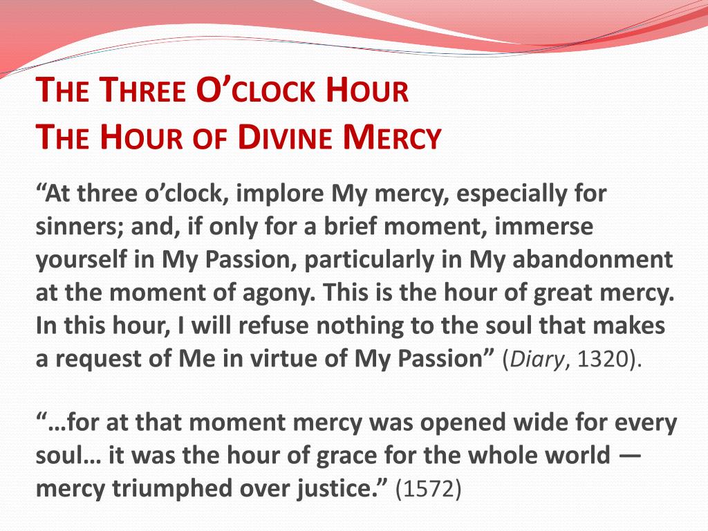 The Three O’clock Hour The Hour of Divine Mercy “At three o’clock, implore My mercy, especially for sinners; and, if only for a brief moment, immerse yourself in My Passion, particularly in My abandonment at the moment of agony. This is the hour of great mercy. In this hour, I will refuse nothing to the soul that makes a request of Me in virtue of My Passion” (Diary, 1320).“…for at that moment mercy was opened wide for every soul… it was the hour of grace for the whole world — mercy triumphed over justice.” (1572)