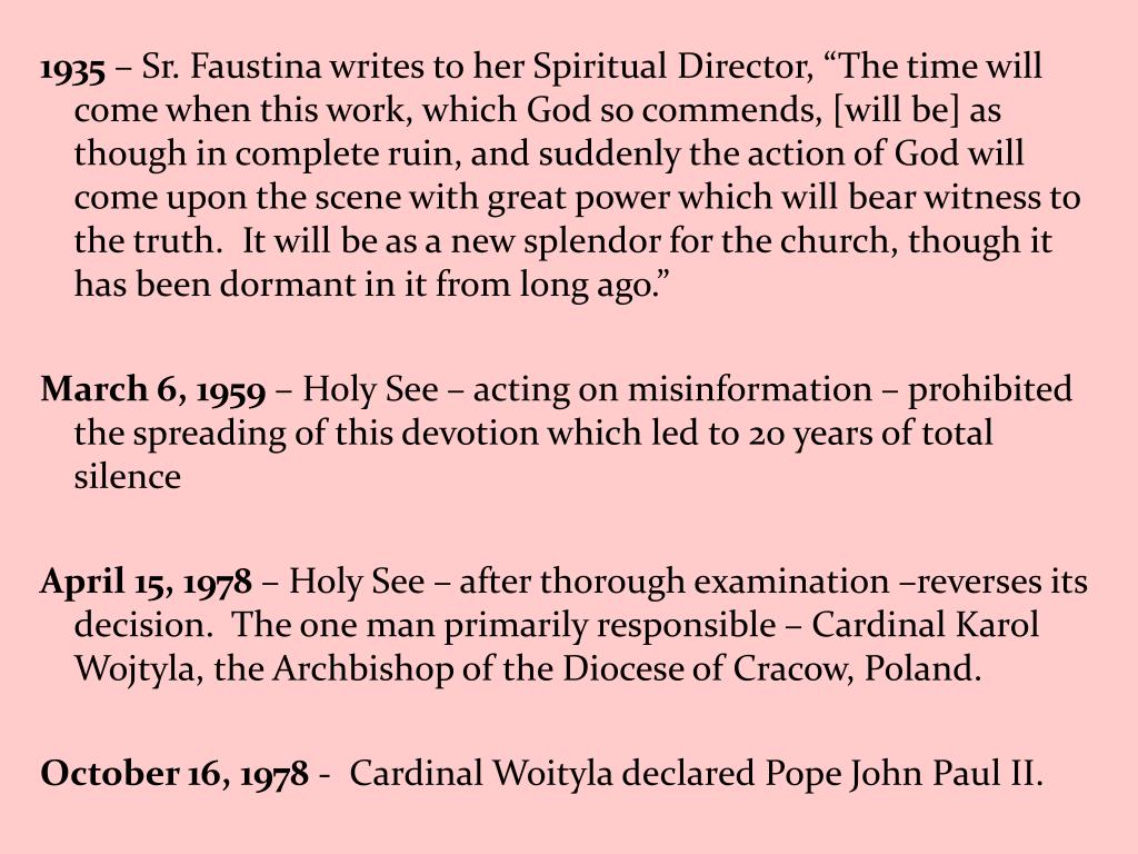 1935 – Sr. Faustina writes to her Spiritual Director, “The time will come when this work, which God so commends, [will be] as though in complete ruin, and suddenly the action of God will come upon the scene with great power which will bear witness to the truth. It will be as a new splendor for the church, though it has been dormant in it from long ago.” March 6, 1959 – Holy See – acting on misinformation – prohibited the spreading of this devotion which led to 20 years of total silence April 15, 1978 – Holy See – after thorough examination –reverses its decision. The one man primarily responsible – Cardinal Karol Wojtyla, the Archbishop of the Diocese of Cracow, Poland. October 16, 1978 - Cardinal Woityla declared Pope John Paul II.