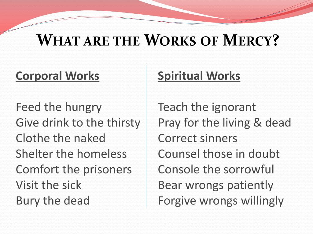 Corporal WorksFeed the hungryGive drink to the thirstyClothe the nakedShelter the homelessComfort the prisonersVisit the sickBury the deadSpiritual WorksTeach the ignorantPray for the living & deadCorrect sinnersCounsel those in doubtConsole the sorrowfulBear wrongs patientlyForgive wrongs willingly What are the Works of Mercy?