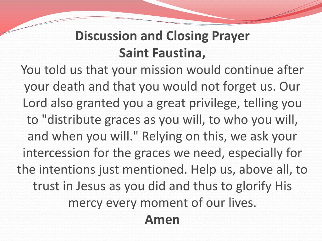 Discussion and Closing PrayerSaint Faustina,You told us that your mission would continue after your death and that you would not forget us. Our Lord also granted you a great privilege, telling you to "distribute graces as you will, to who you will, and when you will." Relying on this, we ask your intercession for the graces we need, especially for the intentions just mentioned. Help us, above all, to trust in Jesus as you did and thus to glorify His mercy every moment of our lives. Amen