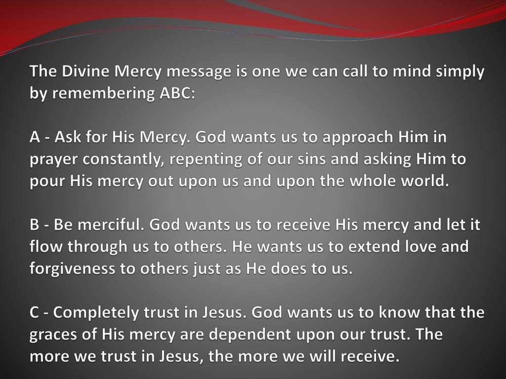 The Divine Mercy message is one we can call to mind simply by remembering ABC:A - Ask for His Mercy. God wants us to approach Him in prayer constantly, repenting of our sins and asking Him to pour His mercy out upon us and upon the whole world.B - Be merciful. God wants us to receive His mercy and let it flow through us to others. He wants us to extend love and forgiveness to others just as He does to us.C - Completely trust in Jesus. God wants us to know that the graces of His mercy are dependent upon our trust. The more we trust in Jesus, the more we will receive.