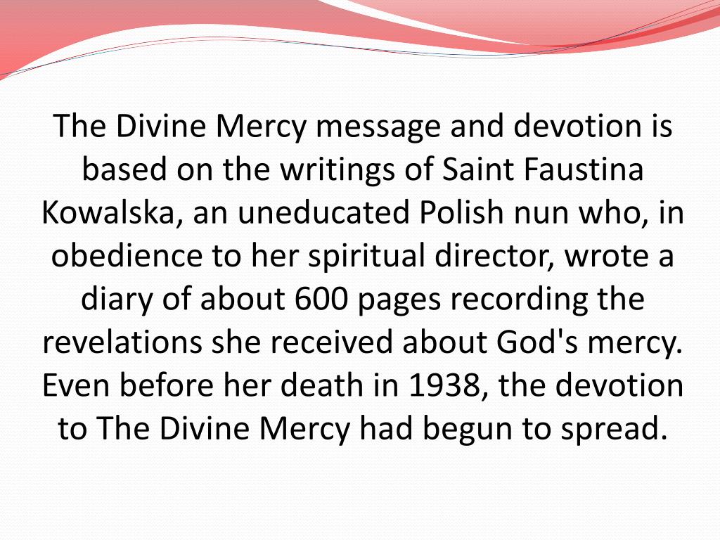 The Divine Mercy message and devotion is based on the writings of Saint Faustina Kowalska, an uneducated Polish nun who, in obedience to her spiritual director, wrote a diary of about 600 pages recording the revelations she received about God's mercy. Even before her death in 1938, the devotion to The Divine Mercy had begun to spread.