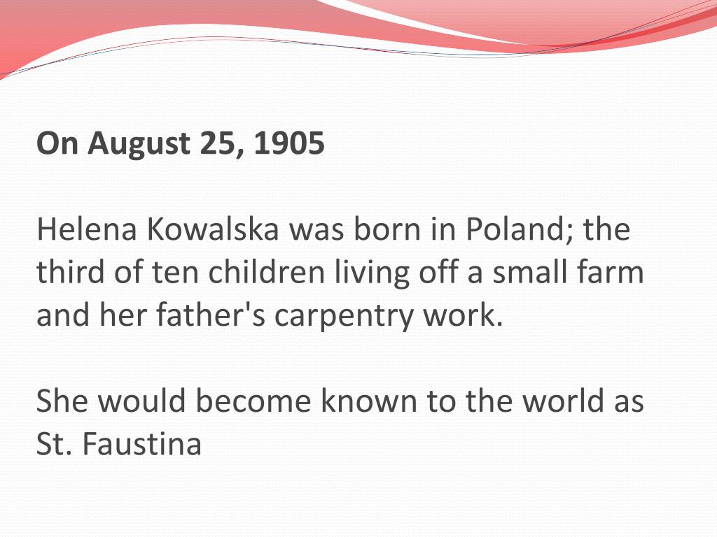 On August 25, 1905Helena Kowalska was born in Poland; the third of ten children living off a small farm and her father's carpentry work.She would become known to the world as St. Faustina