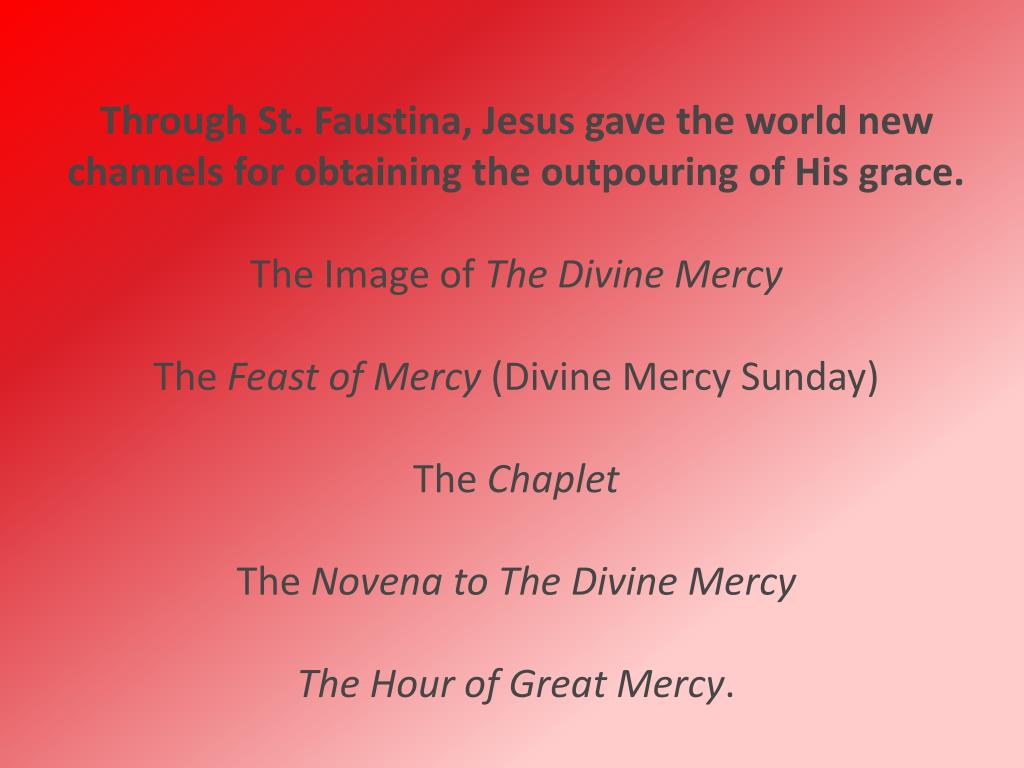 Through St. Faustina, Jesus gave the world new channels for obtaining the outpouring of His grace. The Image of The Divine MercyThe Feast of Mercy (Divine Mercy Sunday) The Chaplet The Novena to The Divine MercyThe Hour of Great Mercy.