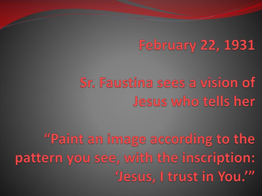 February 22, 1931Sr. Faustina sees a vision of Jesus who tells her“Paint an image according to the pattern you see, with the inscription: ‘Jesus, I trust in You.’”